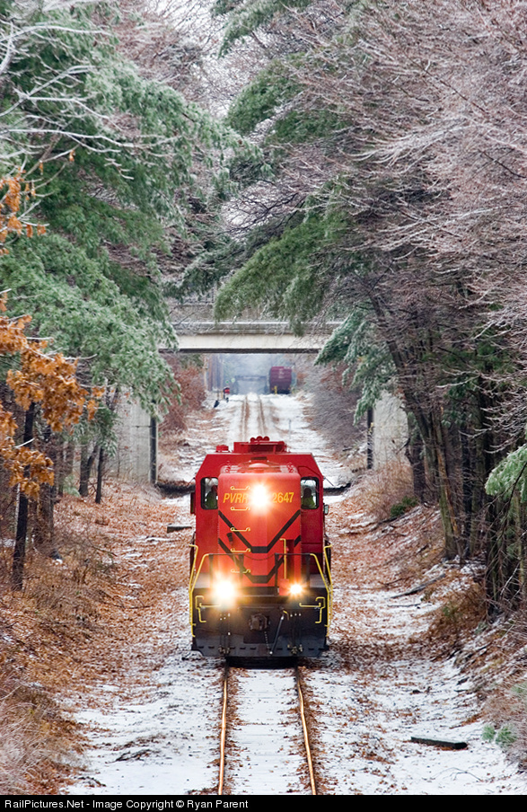 | Ice laden trees form a canopy above PVRR's Holyoke Branch as PVRR 2647 passes beneath, returning back to Westfield Yard after working Railroad Distribution services on the line. |