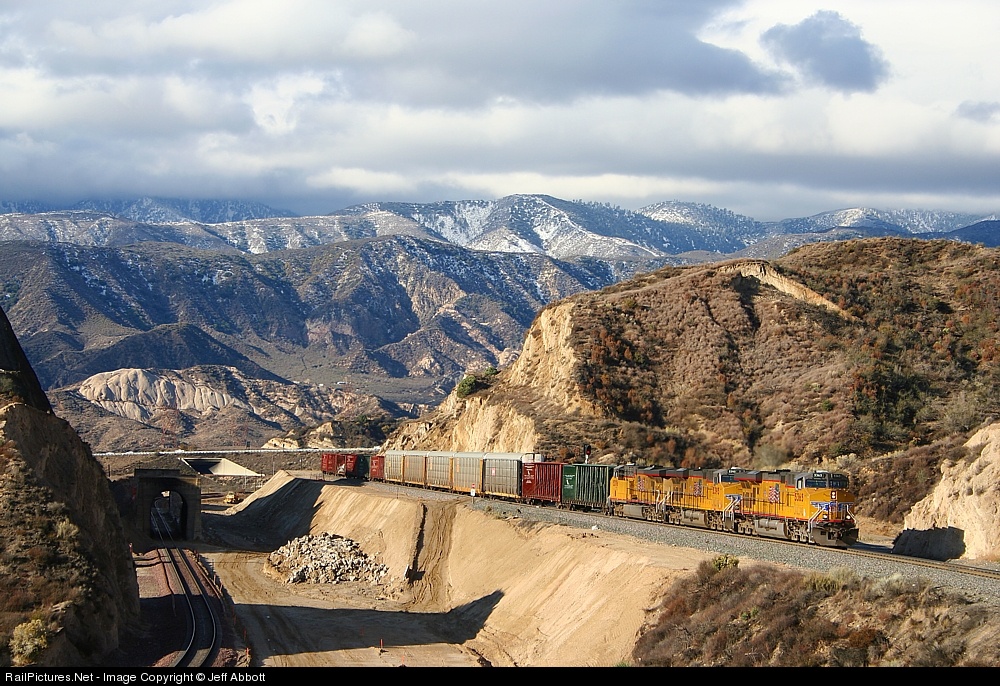 | This UP manifest at Alray appears to steal the glory from an old icon. A shadow covering what was once Santa Fe's Tunnel 2 is appropriate to define what once was, and what soon will be only a memory as BNSF's construction of the third main progresses over the pass. |