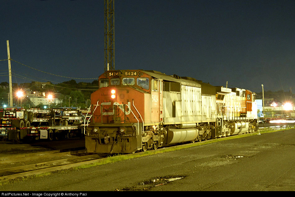 | In my previous photos, I showed you the interior of Canadian National SD50F 5424. Here is this dirty oddball with a BNSF Dash 9 being inspected prior to the morning departure. |