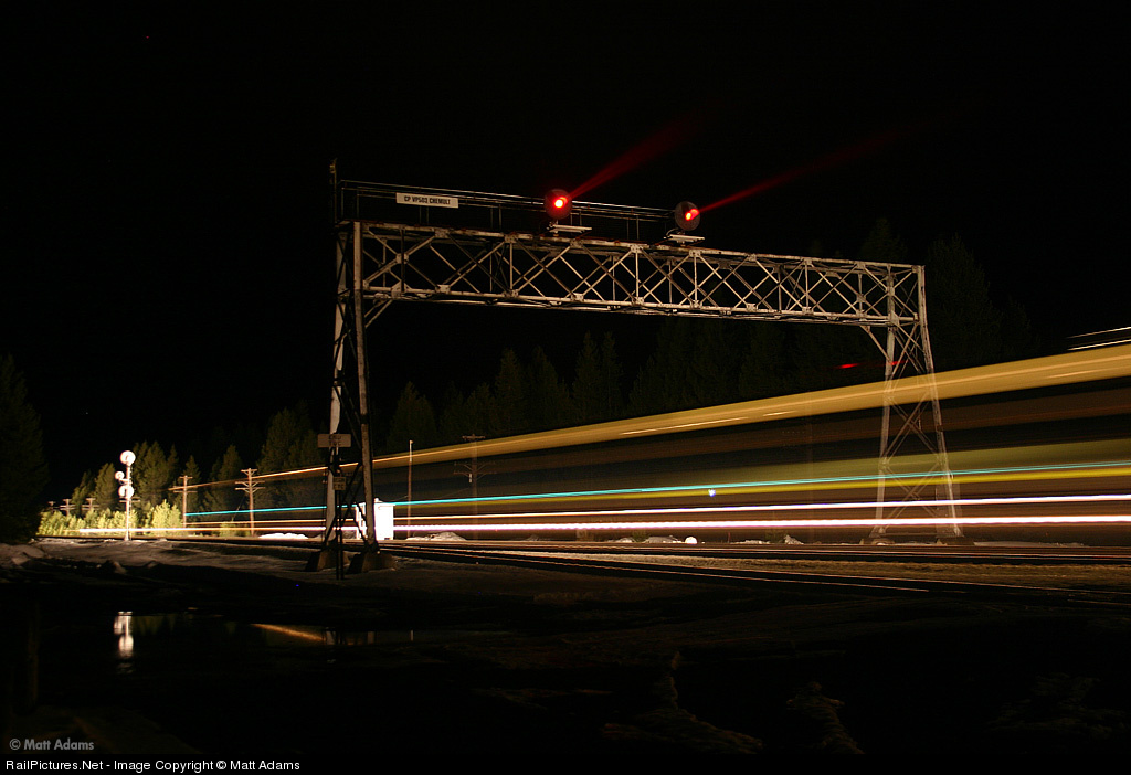 Southbound Coast Starlight illuminates the signal bridge at Chemult.