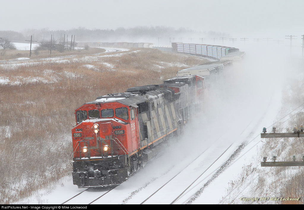 During a brief lull in intensity of the winter storm, CN train 363 makes time through Lovekin, Ontario behind CN 5516 and 2559. Today's train is less than 5000', short by CN standards, and likely in deference to the joys of railroading in snow. 1310hrs.