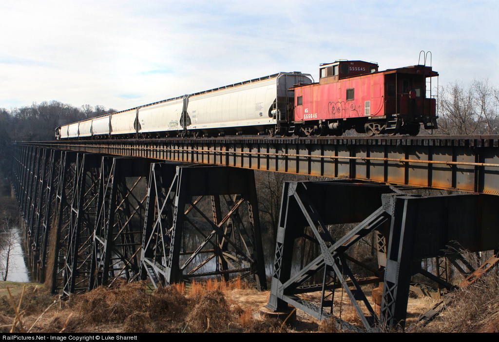 NS caboose #555645 leads the Amherst local across the James River with a GP60 on the rear