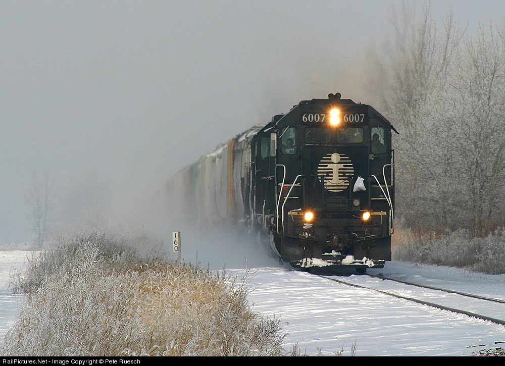 IC 6007 with 6251 and 3103 all in black lug a grain train south through spots of fog and sun.