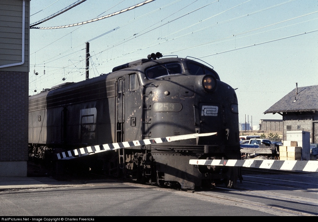 Penn Central E8A #4253 pulls past the manual crossing gates that protected Augusta Street. Because 3300 trains changed from E-units to GG1s (or reverse) here, the watchman had to bring these gates up and down a few times for each arrival. This E-unit was delivered to the PRR in 1952 as EP22 #5793A. Later, in Nov of 1978, ICG rebuilt it into NJDOT #4325 (and another E into 4253). It went on to become MARC #61 and is now in Minerva, OH.
