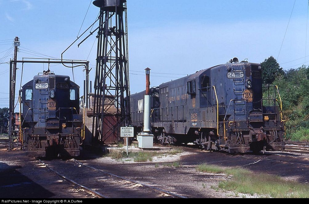 The AC&Y lines seemed to be assigned the oldest power the N&W had after the FM's were gone. These ex NKP GP7's were the standard power during the late 70s and early 80s. Two peas in a pod, the 2425 and 2423 are identical except for their horns. Today's W&LE units are serviced under an updated facility here.