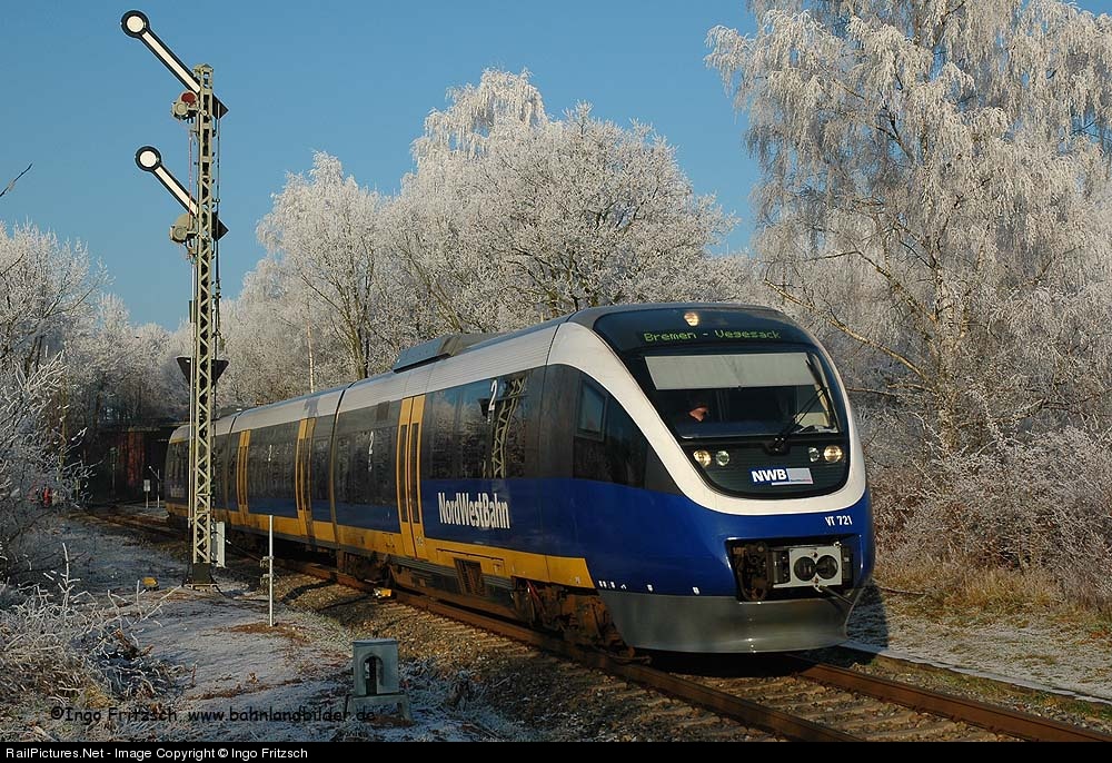 | Nordwestbahn VT 721 passes a very rare formsignal on the for passengertrains reopened Farge-Vegesacker-Eisenbahn in a winter scene. |