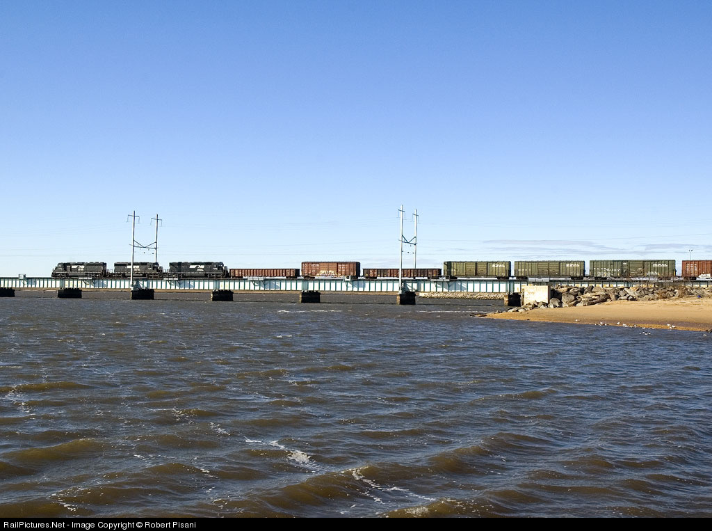 JR-2 crosses Raritan Bay headed for Browns Yard with a heavy transfer from Oak Island Yard. Trailing is NS 3376 (SD40-2) and NS 1700 (SD45-2).