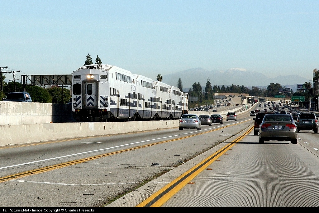Hey, buddy... share the Freeway. The right of way of the San Bernardino Freeway from City Terrace to El Monte is the original Pacific Electric San Bernardino Line ROW, built in 1907. Passenger service was abandoned Oct 15, 1950. Meanwhile, the Ramona Freeway was begun in 1944, sharing the ROW with the then freight only branch. In 1992, this portion of the old PE line was cobbled together with some SP trackage and a ATSF line to create the San Gabriel Sub, now Metrolink's heaviest passenger line after a 42 year absence.