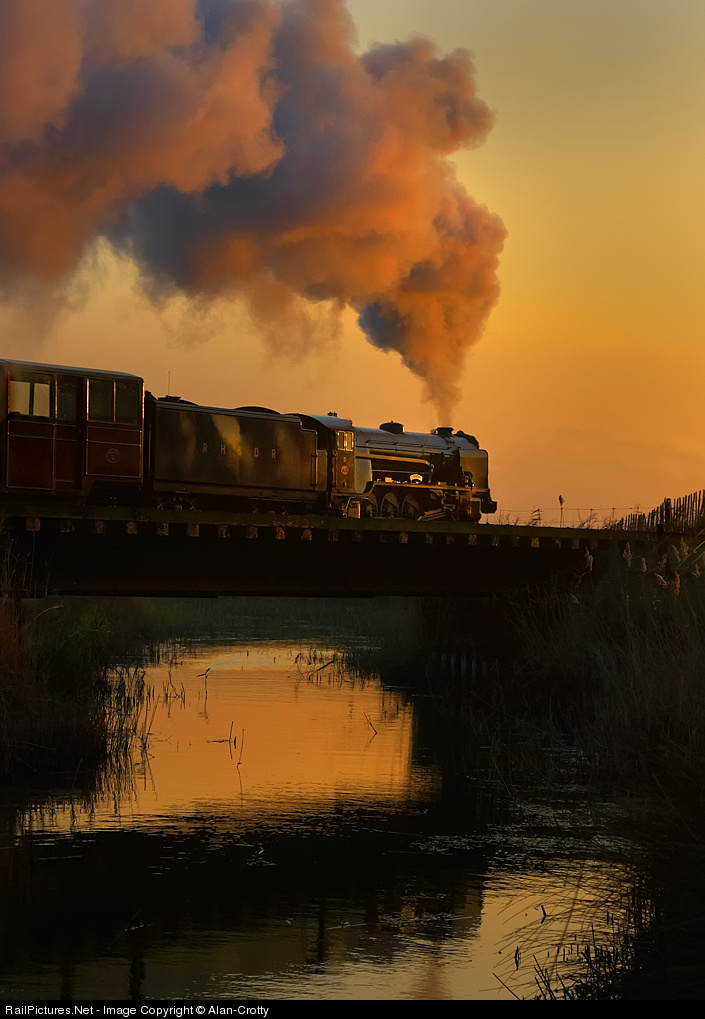 | RHDR mountain heads empty coaching stock from Hythe to New Romney. As it was a bit breezy I had asked the driver to work hard to lift the exhaust. He did, I could hear #6 coming for well over a mile, the exhaust was so high I had to lift the camera and miss part of the reflection. 10 mins later the sun had gone and peace and quiet returned to the Romney Marsh. Thanks to Roger Munn (the driver) for his help in making this picture.