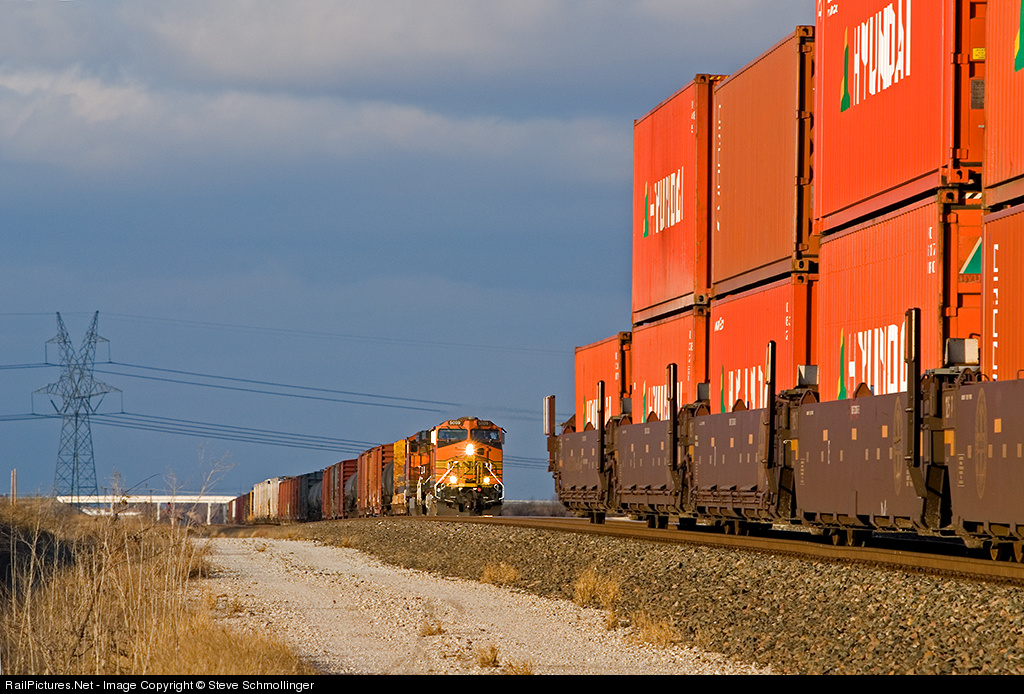 A low-lying sun lights up the vivid orange of the containers on a stack train at Lake Wanda as a southbound manifest on the main overtakes it. The stack train is waiting to use the wye to get onto the Wichita Falls Sub and head for Los Angeles.