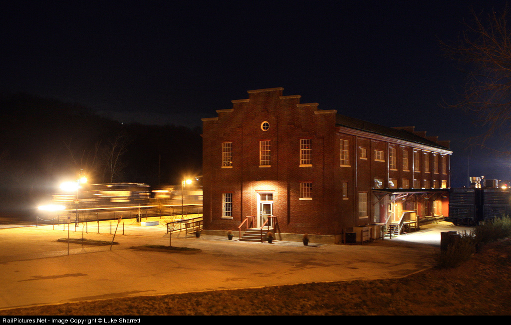 The NS local streaks by the Depot Grille in downtown Lynchburg. Housed in the former Norfolk and Western freight depot, the railroad-themed restaraunt sits adjacent to the NS "old main line" and CSX James River Sub. The kitchen is housed in 2 boxcars behind the depot.