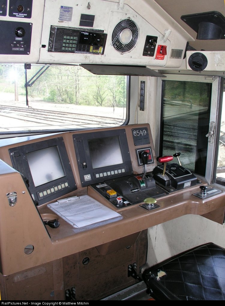 Engineers side of the cab of EMLX 8549, a SD90MAC-HII leased to the Wheeling and Lake Erie Railway in Ohio.