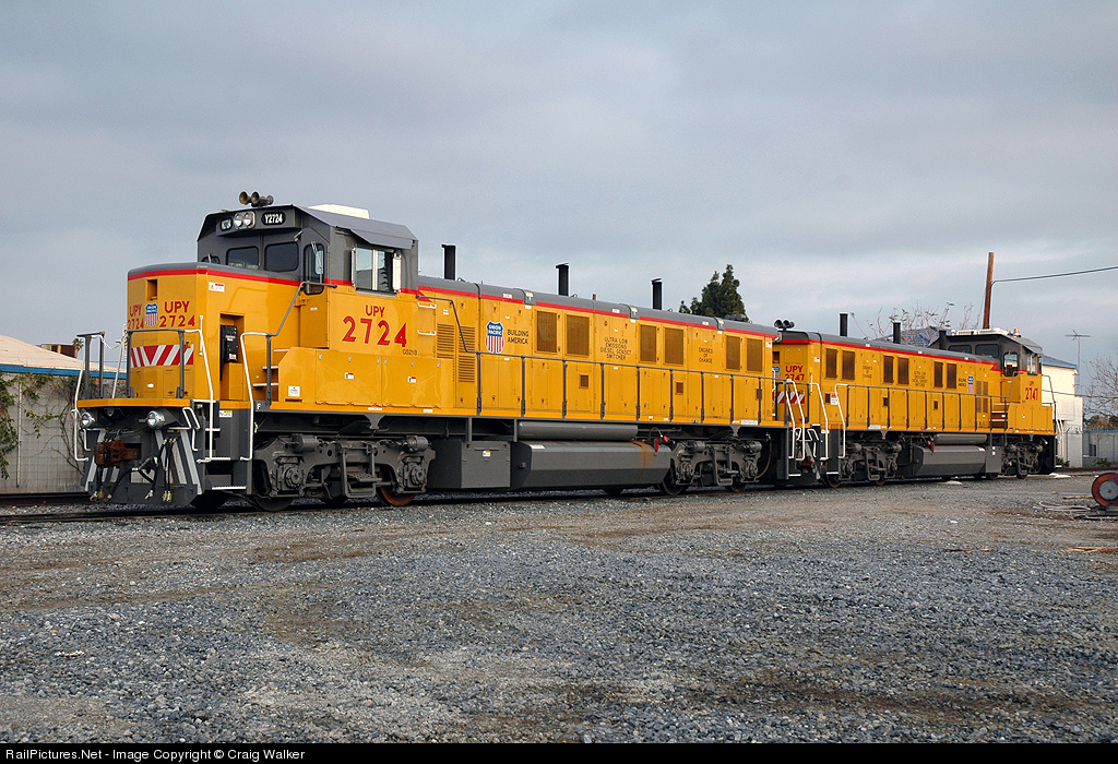 A pair of Union Pacific 3GS21B locomotives, numbers 2724 and 2747, rest at the West Anaheim Yard after operating down to Huntington Beach earlier in the day. These locomotives were both built by National Railway Equipment Company of Mount Vernon, IL, in May and July of 2007.