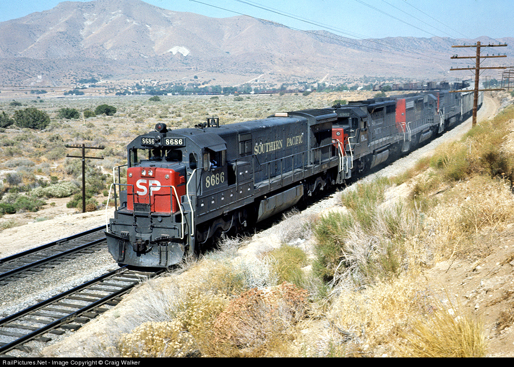 A Southern Pacific westbound, with U33C 8686 in the lead, passes through Soledad Canyon on its way out of the Los Angeles area on July 14, 1973. Engine 8686 was wrecked beyond repair near Los Angeles in May 1978. As they sat in the siding, this occurred: Call 9-1-1!