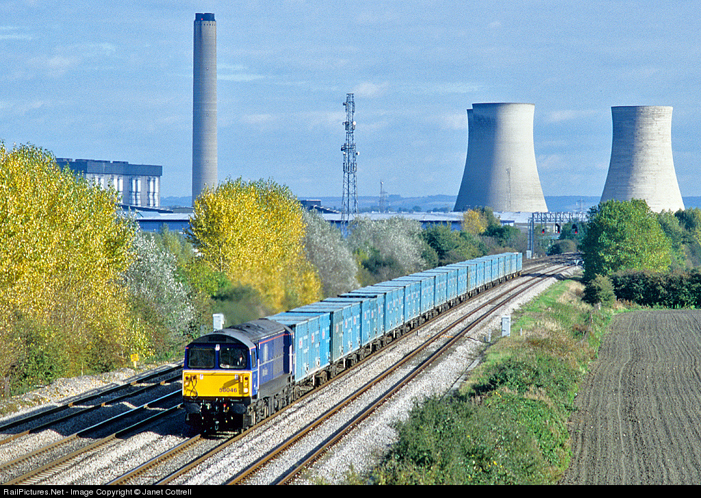 | With Didcot Power Station as a backdrop, 58046 powers westwards on the 1121 Calvert to Bristol Barrow Road "binliner" (household rubbish train). |