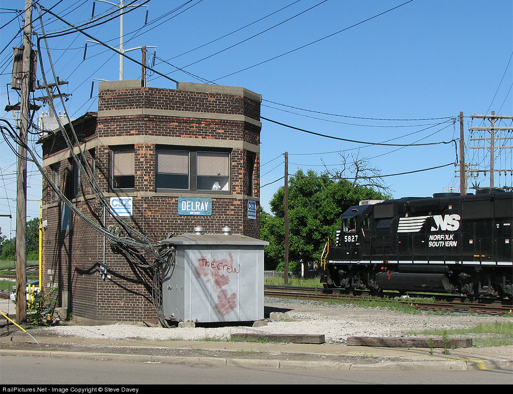 NS 5827 leads a local past the interlocking tower at Delray Junction in Detroit.