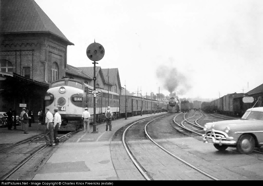 A brand new Hudson Hornet crosses in front of Norfolk & Western/Southern train #151/41, "The Pelican," while the N&W J that brought it into town retreats in the background. FP7 #6144 was delivered to the Cincinnati New Orleans & Texas Pacific in the Fall of 1950. The unit behind it is an F3(B). "The Pelican" was a New York to New Orleans train.