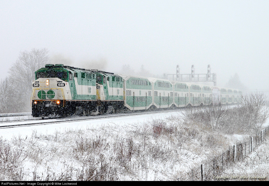 | GO Transit F59's 540 and 536 roll 914's train through the tailend of the New Years storm at Whitby, Ontario. In a few moments, the train will reach the literal end of the line at Oshawa. 1308hrs. |