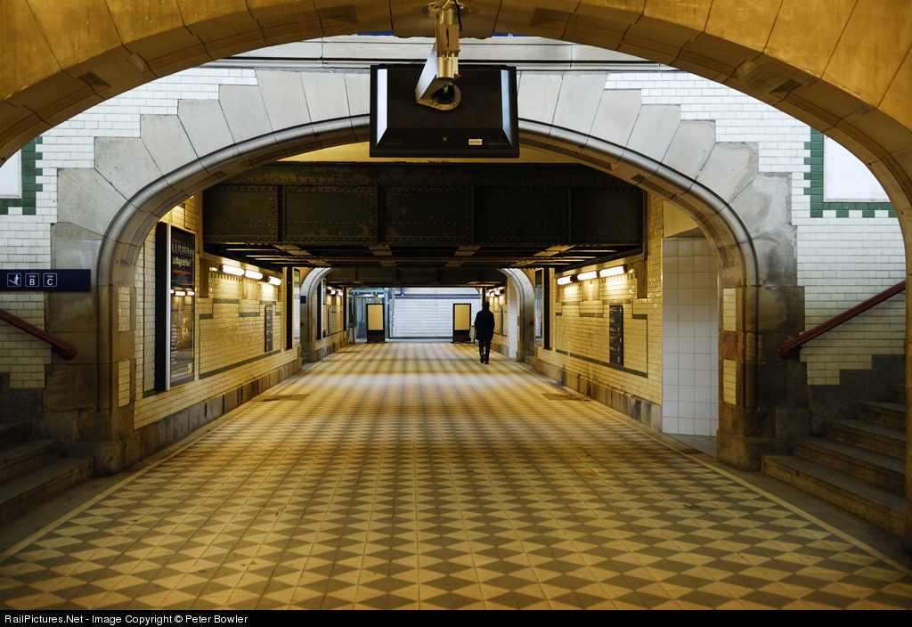 The almost Art Deco quality of the subterranean passageway shows well in this scene. The steel girders supporting the tracks alternate with the extremely clean, tiled interior that serves to allow passengers access to the 6 platforms from the main station above. You see no litter here.