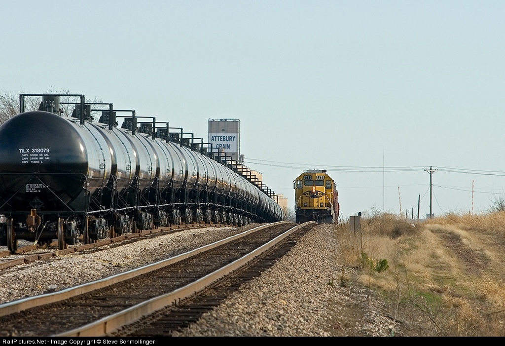 A local out of Saginaw Yard sits at the top of a hogback next to a string of new Trinity Rail tank cars.