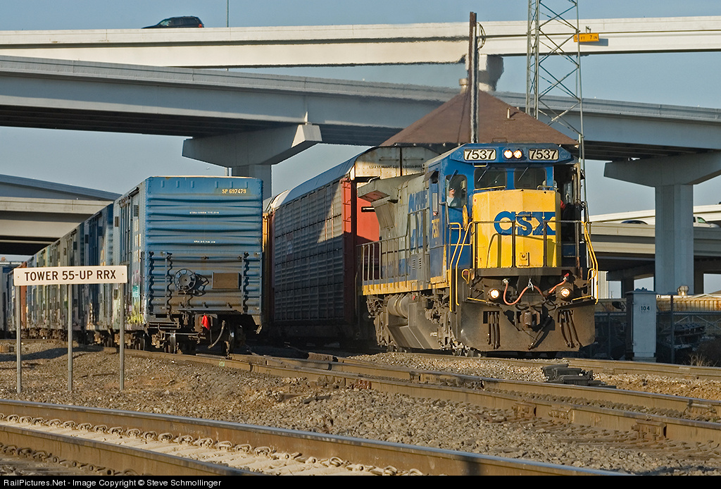 CSX 7537 is the sole unit on a loaded vehicle train at Tower 55 headed down the Midlothian Sub.
