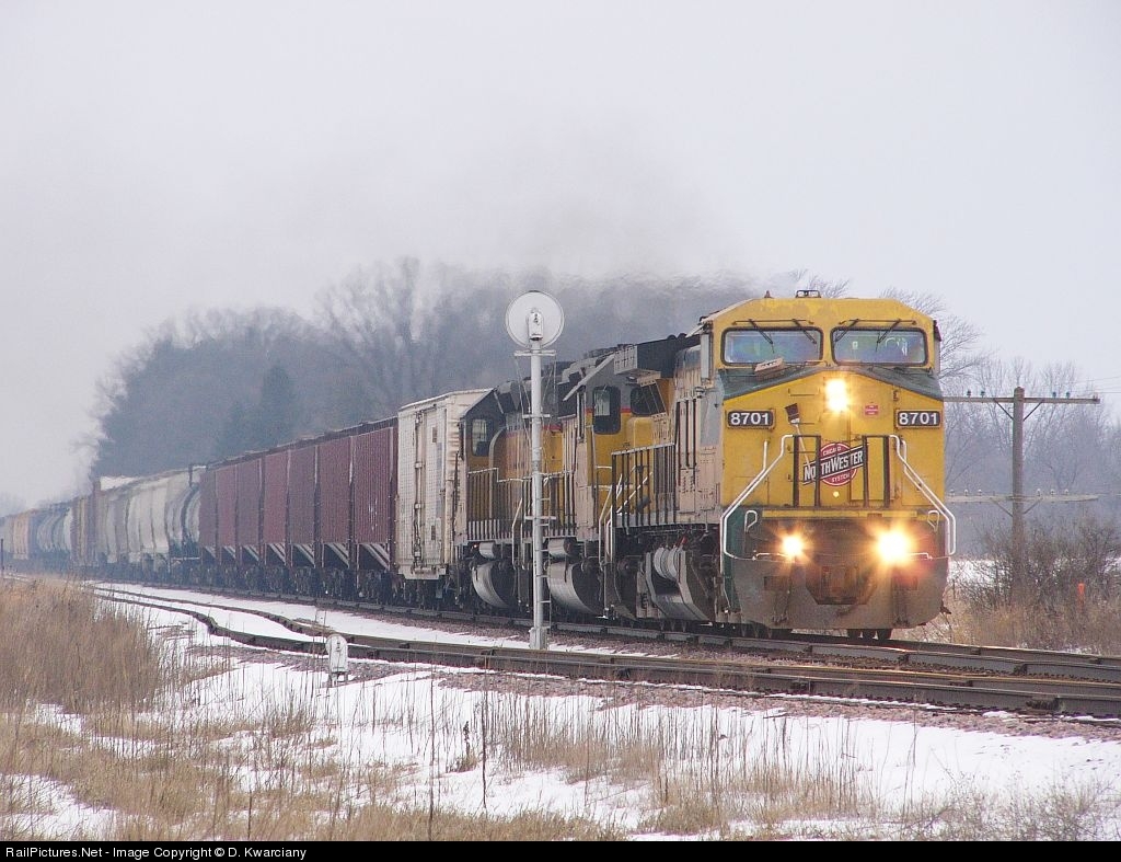 | Not exactly a great day for photos, but then again, it's not everyday a CNW unit is leading. CNW 8701 takes the "Vipper" eastbound at Rodell. |