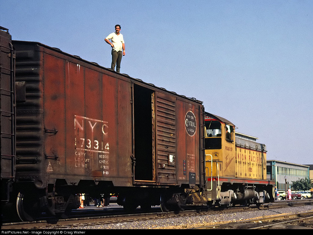| Brakeman Jerry Brown rides atop a cut of cars being switched by Union Pacific NW2 1025 in front of the East Los Angeles passenger station shortly before the arrival of UP train 103, the westbound City of Los Angeles, in February 1970. |