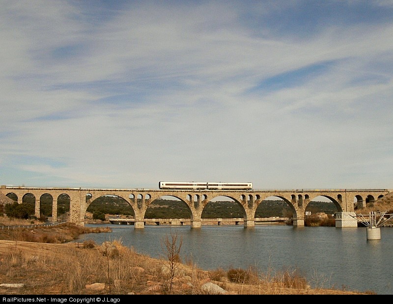 | Tilted train made by CAF with a regional service Madrid to Salamanca cross the Fuentes Claras reservoir, near Avila city. |