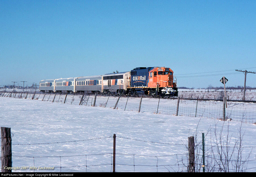 On a bitterly cold February day, Ontario Northland's "Northlander" races across the flatlands just south of Brechin, Ontario, on CN's Bala Sub . I preferred seeing the rebuilt F units on this train, but GP38-2's in mainline passenger service, such as ONT 1808, isn't all that bad either. 1538hrs. Scanned from a Kodachrome 64 slide.