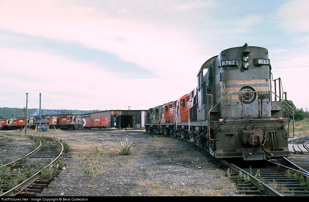 Any help on the locale would be appreciated, lots of CP Alco RS18's lined up at this yard shop complex presumably in Maine. |