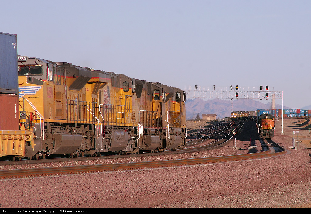 A three way meet at West Daggett. On main three and two eastbounds head up the grade. On the far left/top is a westbound UP coming off the Cima Sub and getting ready to hold for a green signal. Just out of the photo is another westbound BNSF z-train that would have made a four way meet if it had been 30 seconds earlier!