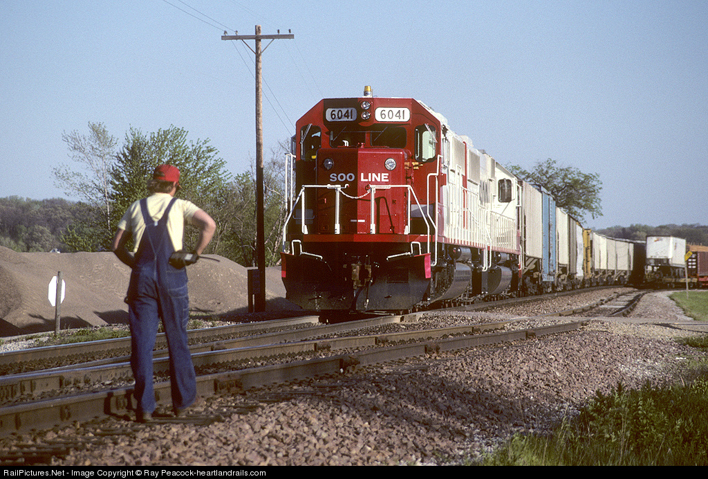| A pair of new SOO SD60's on an eastbound wait for their Conductor to walk back to the headend after a meet. These would be among the last to be painted in the SOO white/red scheme before the switch to candy apple red. |