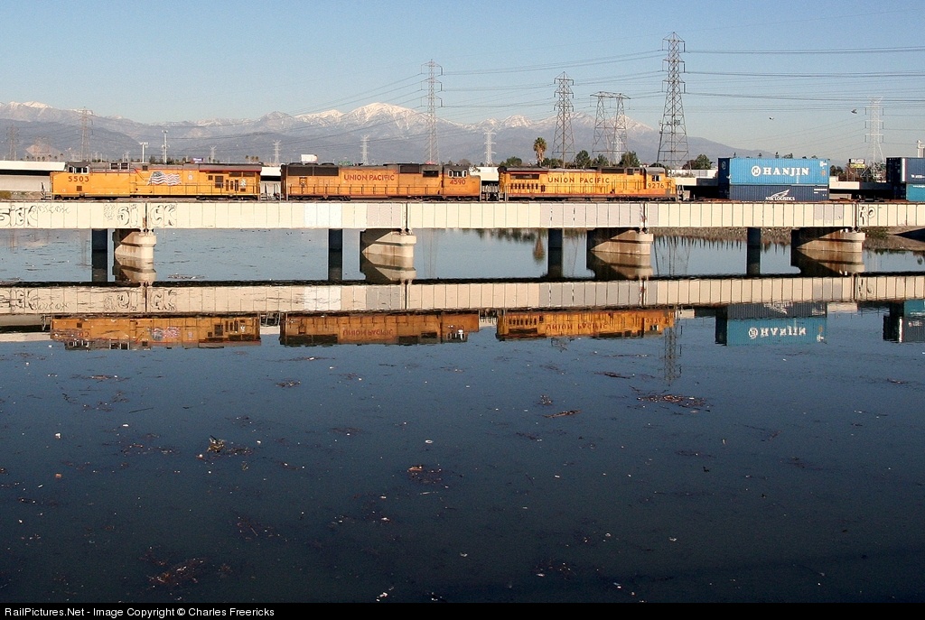 Westbound stacks head over the San Gabriel River, with the snow capped San Gabriel Mountains in the background. This river begins up in those mountains behind it. We are on the old Southern Pacific Sunset Route, now Union Pacific's Alhambra Sub. ES44AC #5503 was delivered 06/05. It is paired with SD70M #4590 (04/01) and Dash 8-40C #9276 (12/88). Okay, who else can't believe Dash 8s are now getting old?