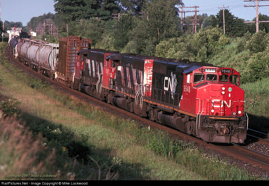 On a long summer evening, CN 9548, 9567, and 9570 bring train 317 through Newtonville, Ontario. Train 317 and it's counterpart 318 were the "dimentional" trains that carried high and wide loads over the Kingston Sub between the Toronto and Montreal terminals. These trains are a memory now, with dimentional traffic moving on regular trains. The regular sight of a trio of GP40-2L's working road freights is also a thing of the past. 1927hrs. Scanned from a Kodachrome 64 slide.