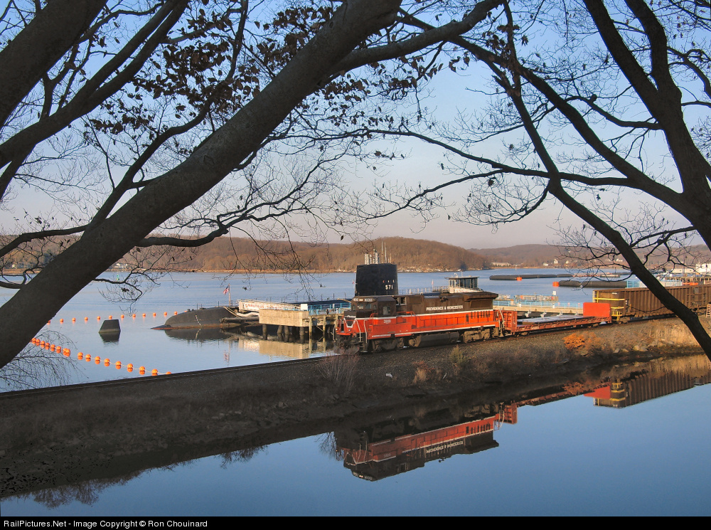 Providence and Worcester's train NR-2, on the Norwich branch, running along the Thames River at Goss Cove, past the Navy Submarine Base and the Nautilus Memorial at Groton. The Nautilus being the first nuclear powered submarine.