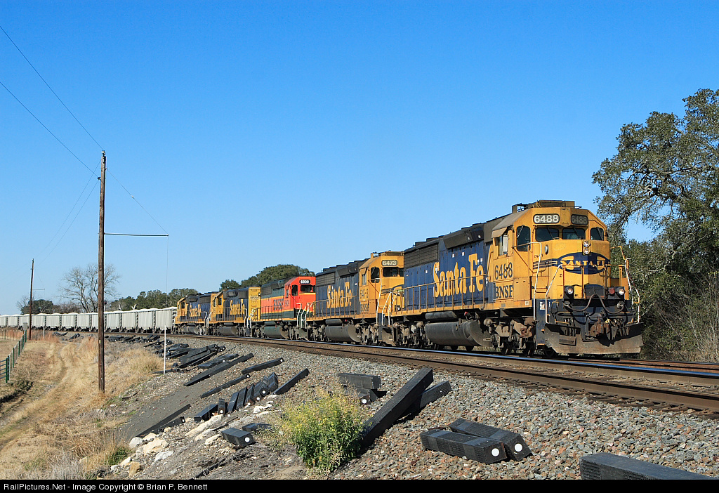 After a frantic repositioning of the tripod, the Brownwood to Pearland limestone train is caught unexpectedly taking the siding at Landes at 1220. The impossibly awesome lashup is SD45-2 6488 SD45-2 6488 (Fourth 45-2 delivered to AT&SF; ex-ATSF 5838, nee-5628, built May '72); SD45-2 6473 (ex-ATSF 5823, 7223; nee-5695; built May '73); SD40-2 6909 (ex-BN 6902, nee-6366; built March '73); SD40-2 6957 (ex-ATSF 5212, built October '78); and SD45-2 6501 (ex-ATSF 5851, nee-5639; built May '72).