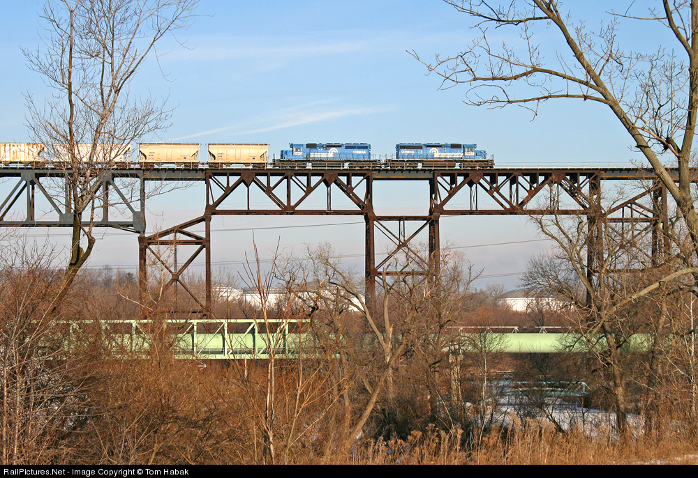Via trackage rights, NS BX44 heads east over the trestle with two consecutively numbered ex-CR engines, the 3404, and 3405