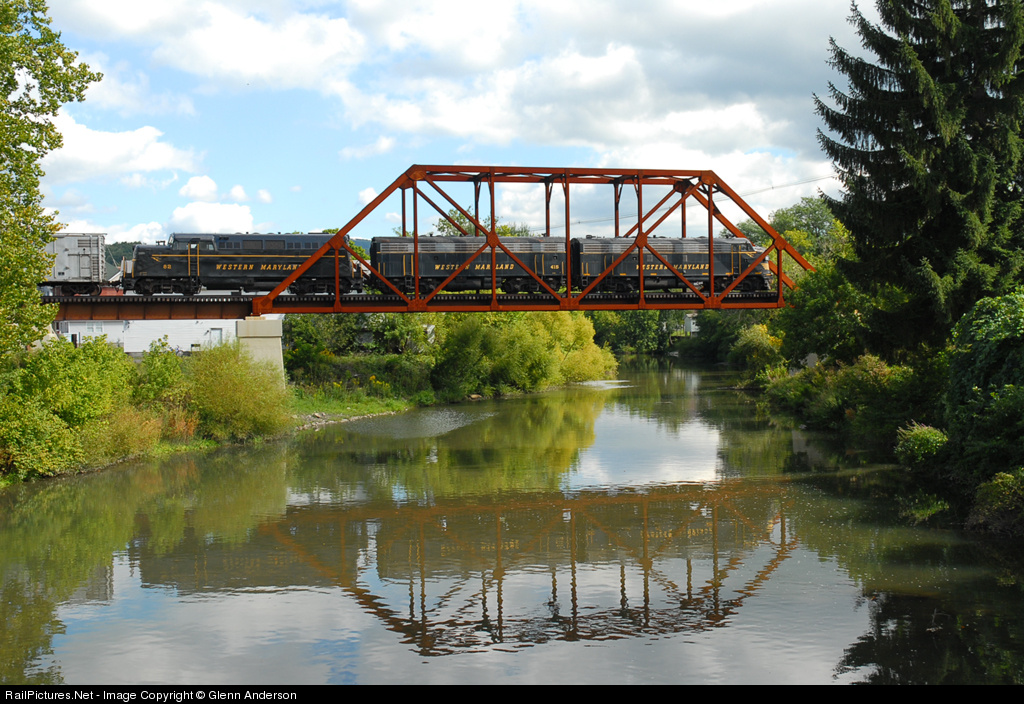 | West Virginia Central operated a Photographer's Special from Elkins to Tygart Jct., WV for the Mountain State Railroad & Logging Historical Association. The crew provided an impromtu photo session by pulling the train with WM-painted FP7 67, F7B 415 and BL2 82 onto the newly rebuilt bridge before backing into the ex-WM station for boarding. |