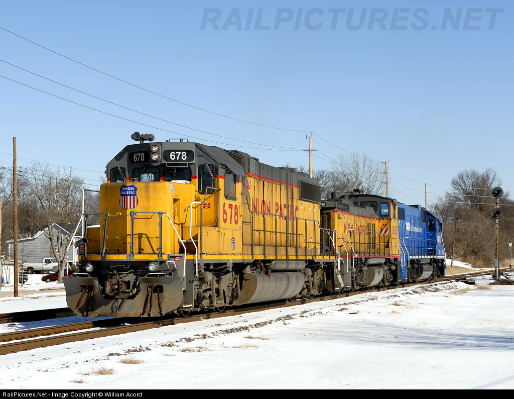 Union Pacific motive power preparing to make a back up move to pick up a cut of hopper cars in Pevely, MO on a beautiful Ground Hog Day 2008. The GP38-2 is an ex-Missouri Pacific unit. The UP 1363 immediately behind it(a GP40-2) is an ex-Southern Pacific unit, and was owned by St. Louis Southwestern Railway Company(SSW, or "Cotton Belt"), and the Denver and Rio Grande Railway after SSW ownership.
