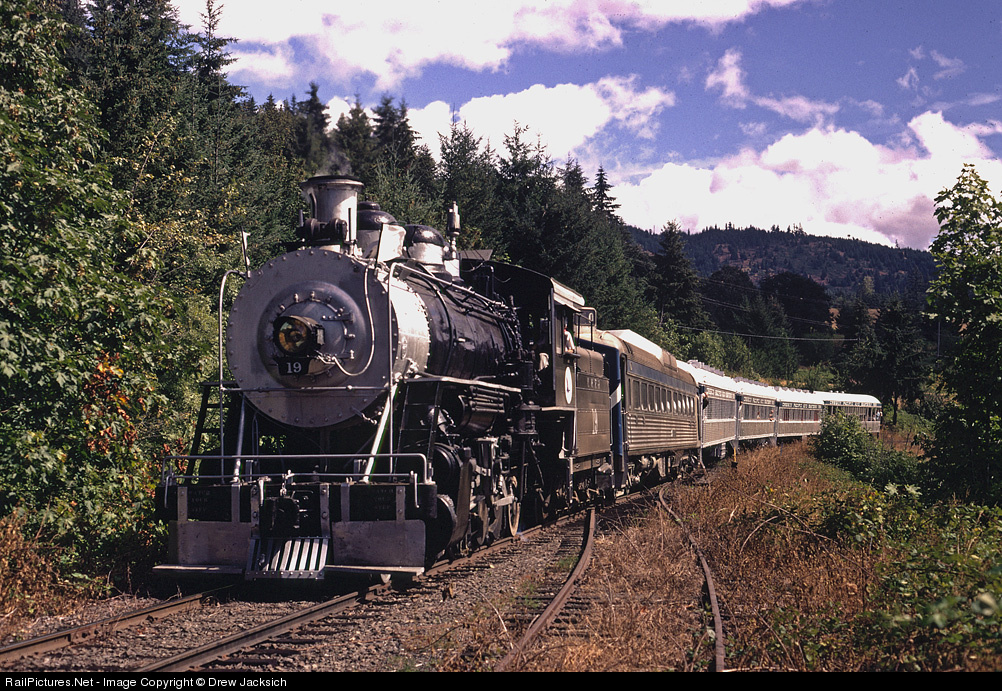 Running on the now gone Oregon, Pacific, & Eastern owned by Kyle Railways, Yreka Western #19 (a former McCloud engine) is pulling an excursion train back to Cottage Grove from Dorena. #19 is now back in Yreka, but the OP&E is now a hiking trail. Behind the locomotive is former SP RDC #10 which worked on the NWP until the advent of Amtrak.