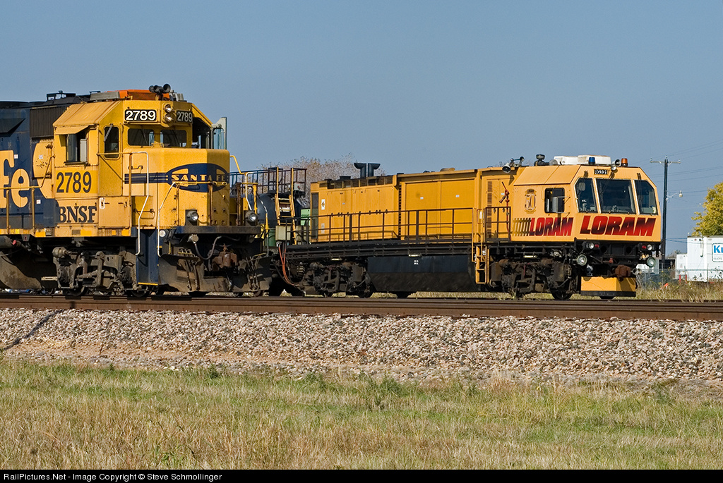 BNSF local power sits next to a Loram rail grinder at the Saginaw interlocker.