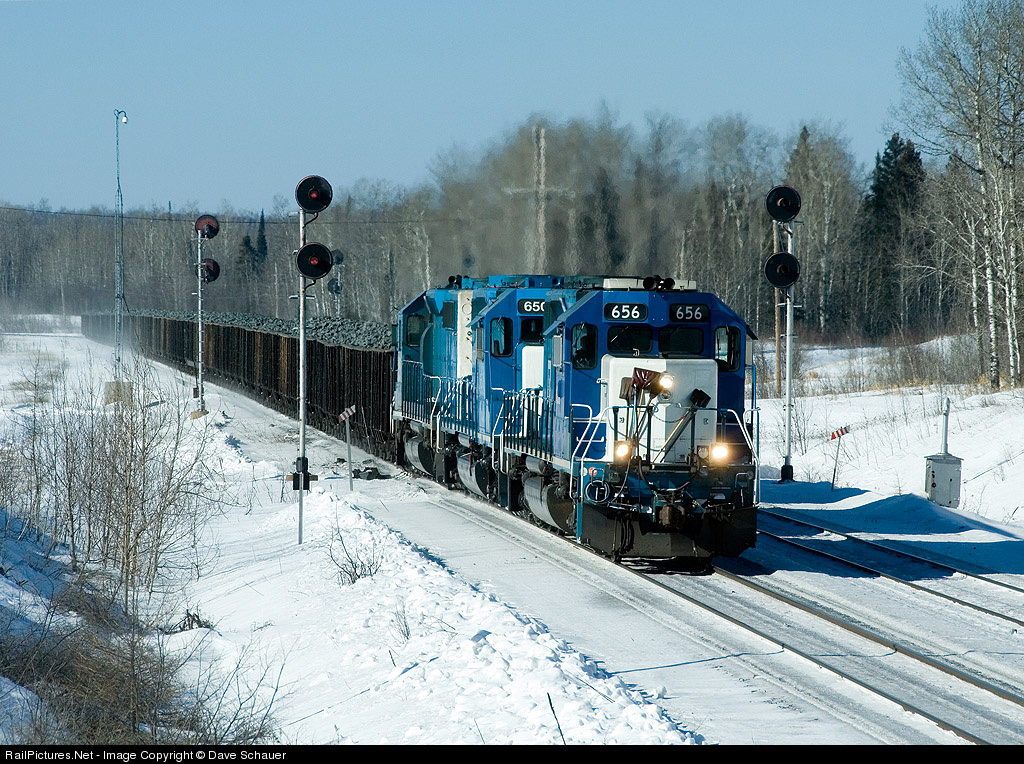 | This 79-car train won't encounter any fresh snow today, but if they did I'm sure the four shovels and one switch broom on the nose of 656 would come in handy. After all, this is northeastern Minnesota! |
