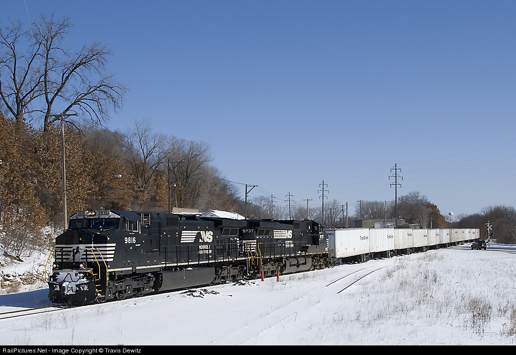 | NS 9816 pulls its Triple Crown train towards the Twin Cities on this -10 degree day with a good 10-20 mph wind. You can see the Altoona water tower in the background and the old spur that served the Uniroyal Tire Plant in the foreground. |