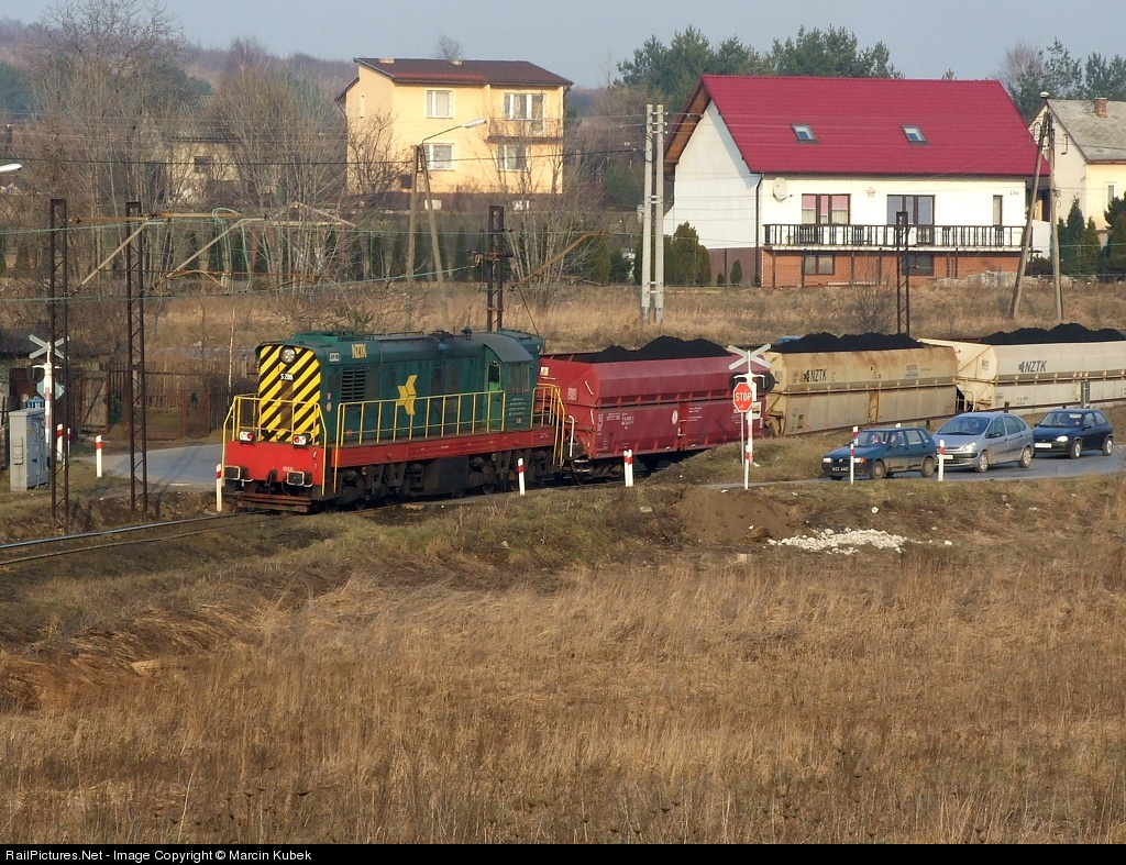 | Rear helper locomotive class S200 with half of heavy coal train (17 cars) to Siersza Power Plant. First loco is S200 - 261. This train was subdivide because route is very uphill. Full power (2x1300hp) and speed about 10mph. |