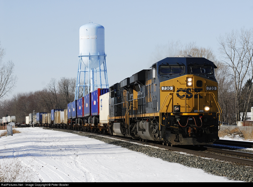 It appears that CSX has more than one locomotive with this road number, as there is an EMD SD70MAC CSX 730 as well. This one leads a hotshot trailer train though Conneaut past the water tower that used to have the town name painted prominently on it.