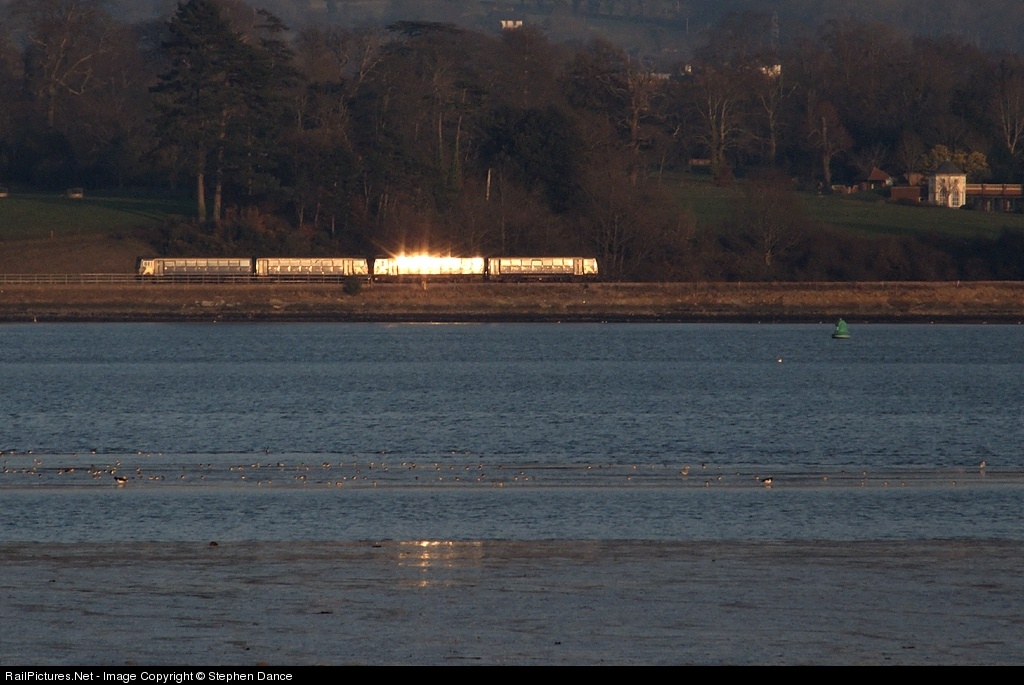 | Seen from across the estuary of the River Exe at Powderham, 2 class 142 railcars fail to disturb the local birdlife while working an evening service to Exmouth |