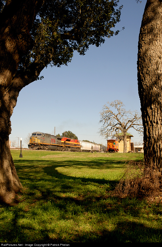 A KCS trackage rights train heads through Flatonia, TX on its way to the former TexMex near Corpus Christi, TX.