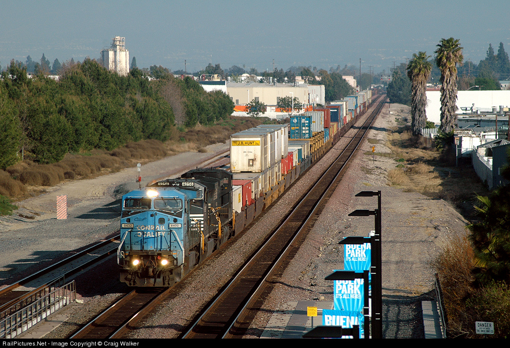 | BNSF Railway train Q-NYCLAC6-14A is in the charge of Norfolk Southern power (Dash 8-40CW 8432, Dash 9-40CWs 9256 and 8959) passes through the Metrolink station in Buena Park, California, as it heads westbound to it final destination of Los Angeles. NS 8432 is the former Conrail 6252. |