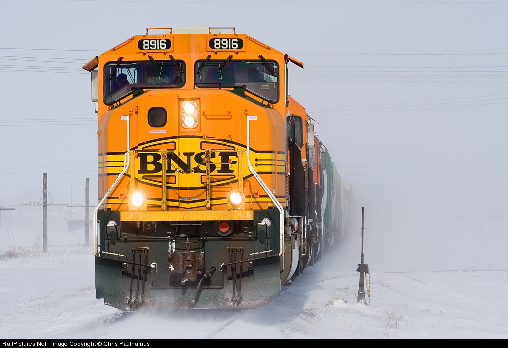 The daily Grand Forks, ND - Northtown, MN manifest heads south in blowing snow. Arctic high pressure systems are known for their crystal clear blue skies, but what's overlooked is that when they arrive after a dusting of fresh snow, the winds whip up the snow and drop visibilty in open areas (read: the entire state of North Dakota). This train is coming toward me yet look in front of the plow...the wind-driven snow is out-pacing the MAC!