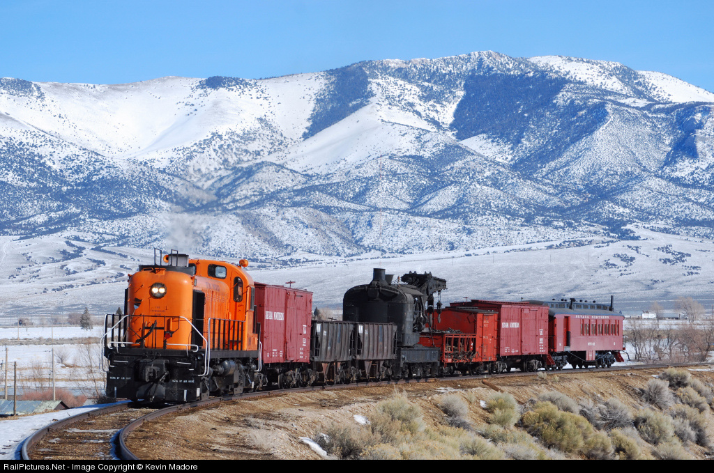 The snow covered mountains surrouding Ely, Nevada serve as a backdrop for this view of a Nevada Northern work train. This train includes NNRy's 100-ton "Big Hook", an operable, steam-powered wrecking crane, as well as the crane's idler car and a restored outfit car for the crew.